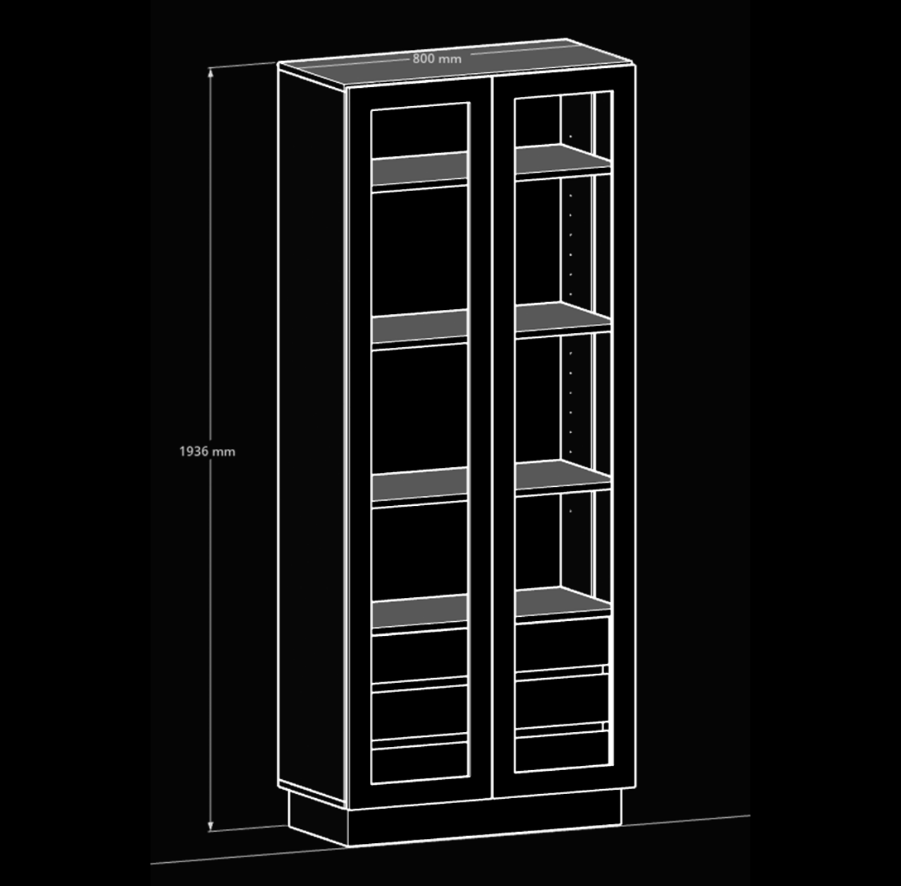Columna realizada en madera MDF 18 mm melamina Paraíso. Puertas de aluminio color negro con vidrio transparente con sistema de apertura Push-Open y bisagras de cierre suave. 3 cajones de guardado con correderas telescópicas y 3 estantes regulables en altura. Cuenta con perfil de aluminio y su difusor, previsto para colocación de led.